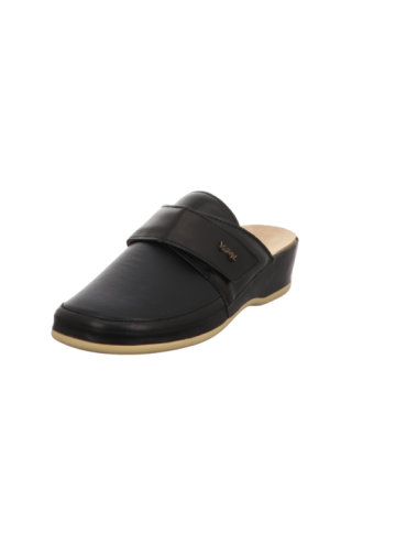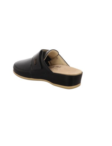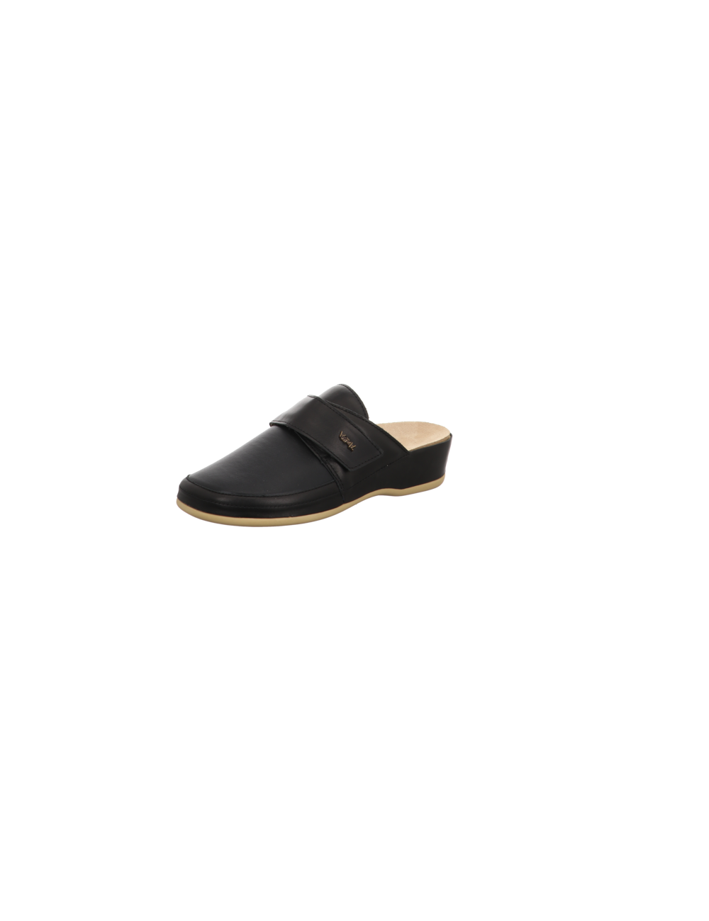 Pantolette aus schwarzen Glattleder. Das einzigartige, undeformierbare Vital-Tieffußbett sorgt für eine sanfte Reflexzonenmassage und kann je nach Belieben ausgetauscht werden. Der Absatz misst eine Höhe von ca. 3,5 cm. Das Futter ist aus naturgegerbtem Kalbleder und daher frei von jeglichen Schadstoffen. PU-Sohle.