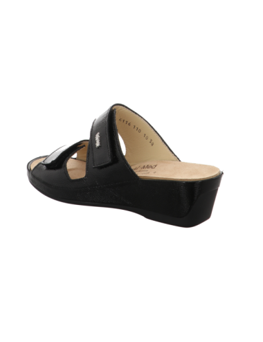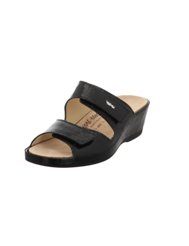 Medic - Modelle Pantoffel in schwarzen Lackleder mit zwei Klettverschlüßen und einer Keilabsatzhöhe von ca. 5,5 cm. Gummisohle. Das Futter ist aus naturgegerbtem Kalbleder und daher frei von jeglichen Schadstoffen.