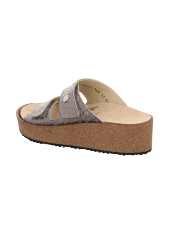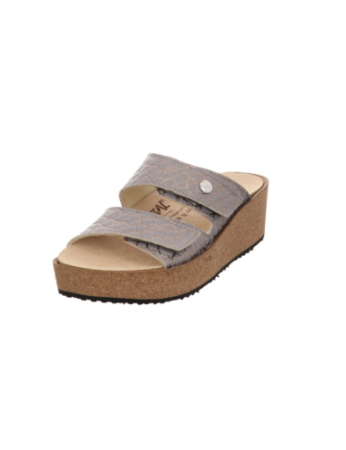 Pantoffel mit Keilabsatz und herausnehmbaren Fußbett. Hier in grau kombinierten Glattleder mit einer Absatzhöhe von ca. 4,5 cm und Gummisohle.